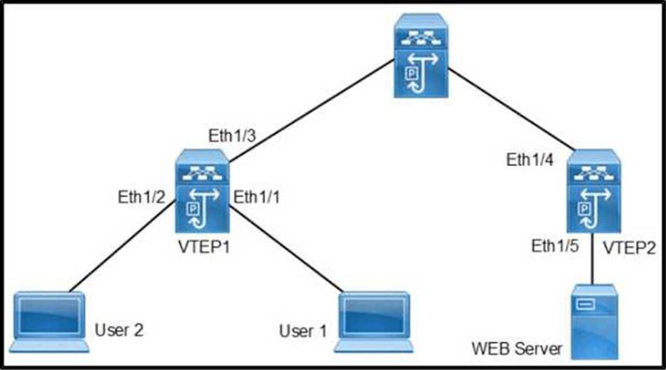 User1 and User2 are connected to VTEP1 switch. The users can reach the WEB server. The monitoring tool shows degrading network performance and excessive traffic is sent from User2 to reach the WEB server.