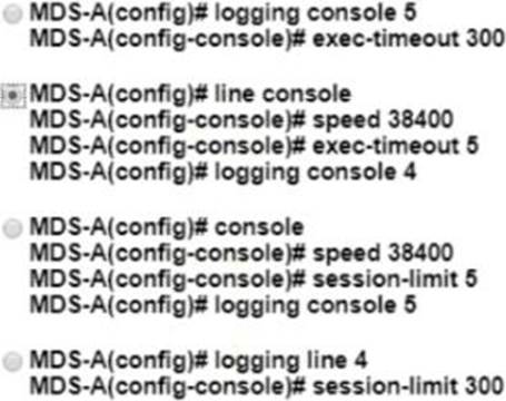 23. A network engineer needs to configure system logging on the Cisco MDS Series Switch. The messages must be displayed with the severity level of "warning" and above. For security reasons, the users must be logged out of the console after 5 minutes of inactivity.
