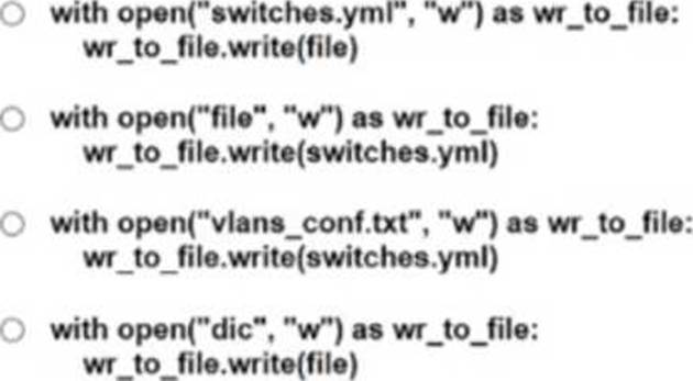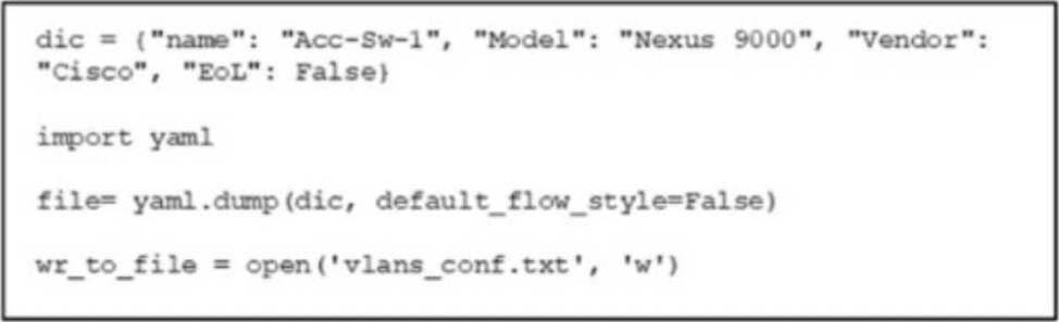 An engineer must create a Python script to convert a Python dictionary called dic to a YAML format and add the output to a file called switches.yml.
