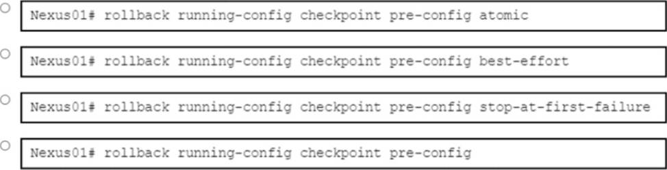 22. A network engineer must roll back a configuration change made on a Cisco Nexus 9300 Series Switch. Before the change, the network engineer created a checkpoint named pre-config. The rollback abort if any errors occur.