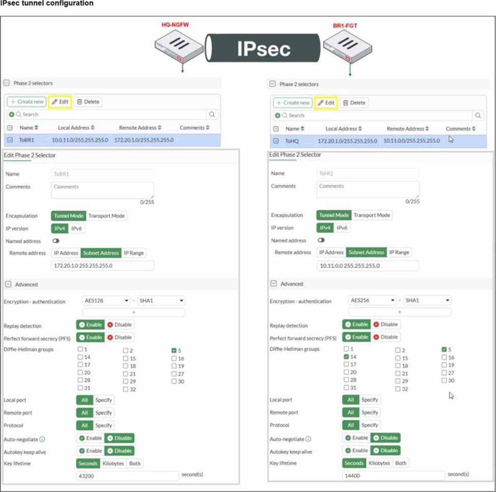 Based on the phase 2 configuration shown in the exhibit, which two configuration changes will bring phase 2 up? (Choose two.)