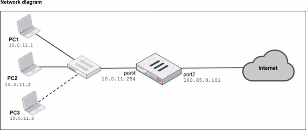 Two PCs. PC1 and PC2, are connected behind FortiGate and can access the internet successfully. However, when the administrator adds a third PC to the network (PC3), the PC cannot connect to the internet.