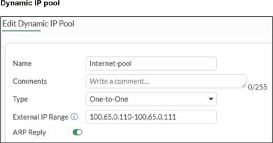 The exhibits show a diagram of a FortiGate device connected to the network, as well as the IP pool configuration and firewall policy objects.