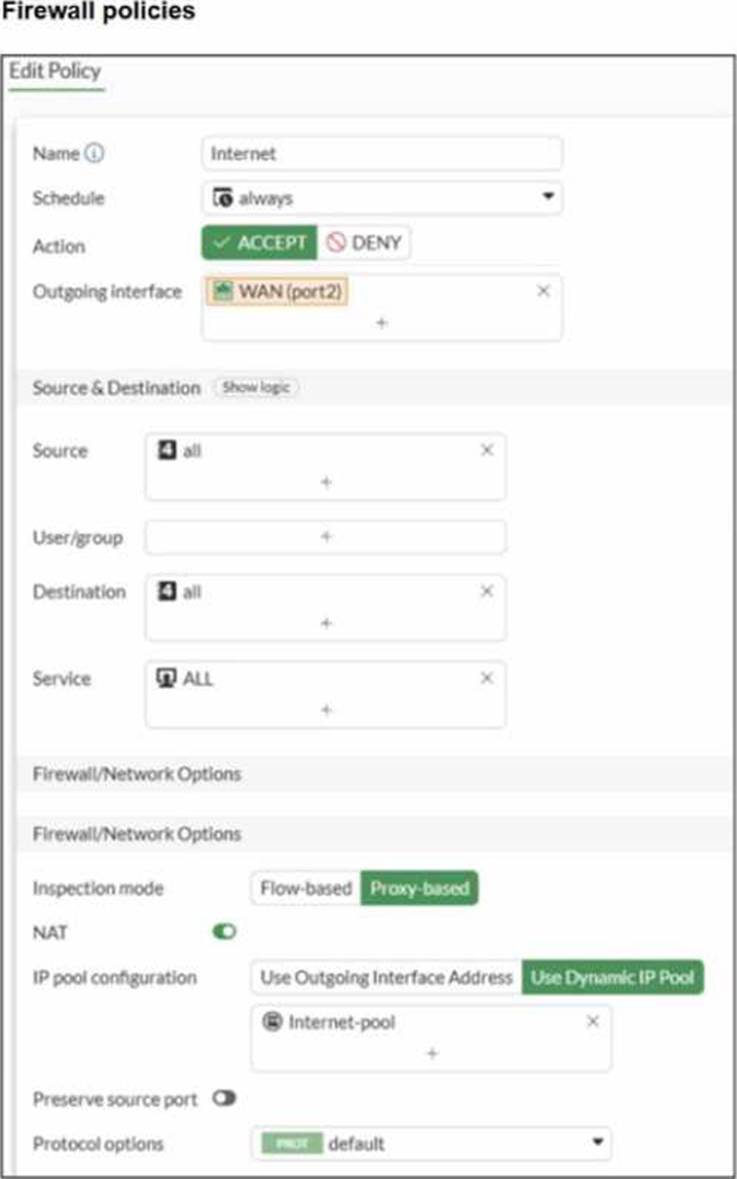 A diagram of a FortiGate device connected to the network, as well as the firewall policy and IP pool configuration on the FortiGate device are shown.