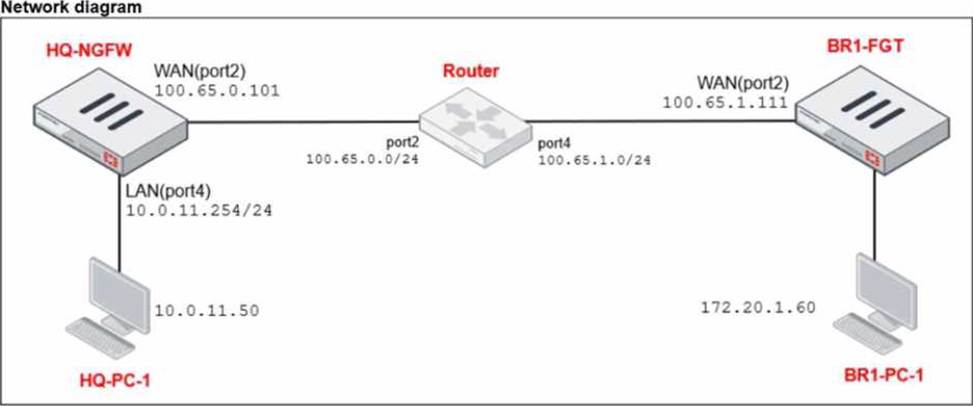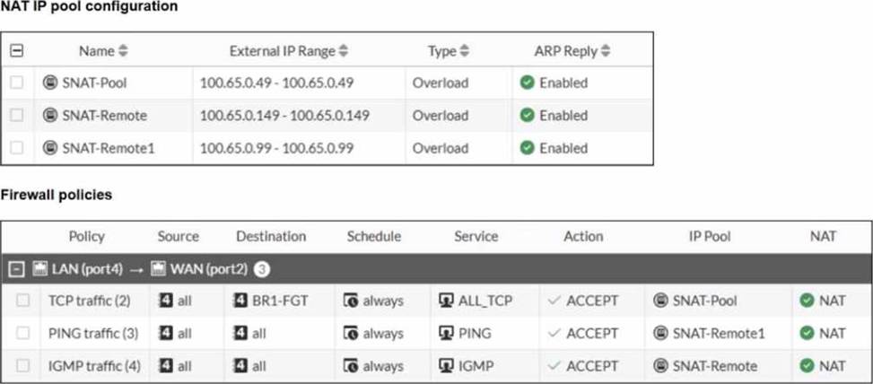 Which IP address will be used to source NAT (SNAT) the traffic, if the user on HQ-PC-1 (10.0.11.50) pings the IP address of BR-FGT (100.65.1.111)?