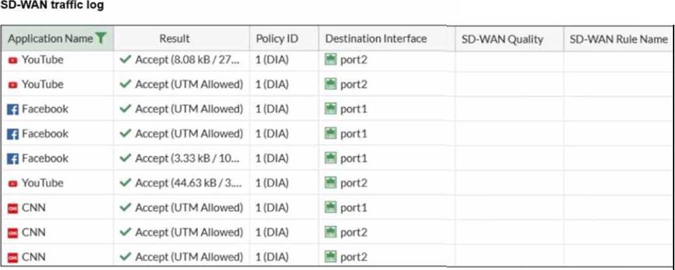 The administrator configured SD-WAN rules and set the FortiGate traffic log page to display SD-WAN-specific columns: SD-WAN Quality and SD-WAN Rule Name