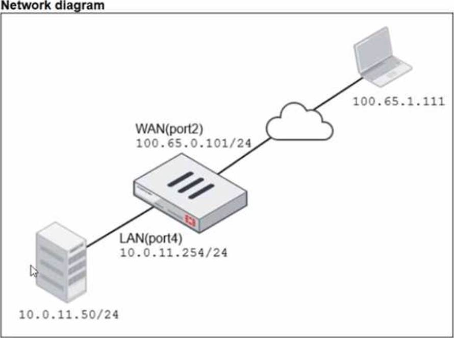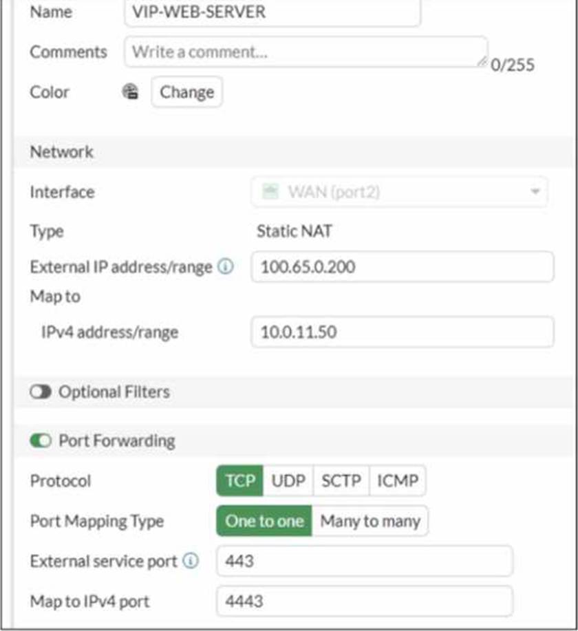 A diagram of a FortiGate device connected to the network VIP object and firewall policy configurations are shown.