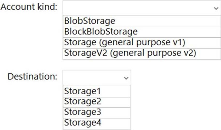 Which type of storage account should you use, and which account should you configure as the destination storage account? To answer, select the appropriate options in the answer area. NOTE: Each correct selection is worth one point.