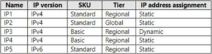 6. You have an Azure subscription that has the public IP addresses shown in the following table.