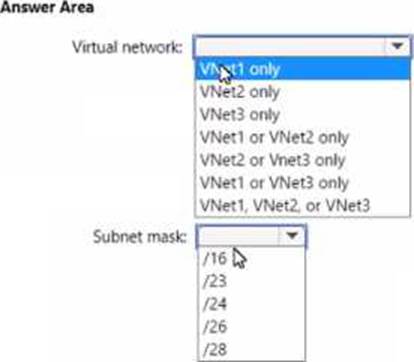 To which virtual networks can you connect con-env1, and which subnet mask should you use? To answer, select the appropriate options in the answer area. NOTE: Each correct selection is worth one point.