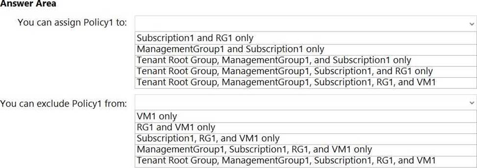To which Azure resources can you assign Policy and which Azure resources can you specify as exclusions from Policy1? To answer, select the appropriate options in the answer NOTE Each correct selection is worth one point.