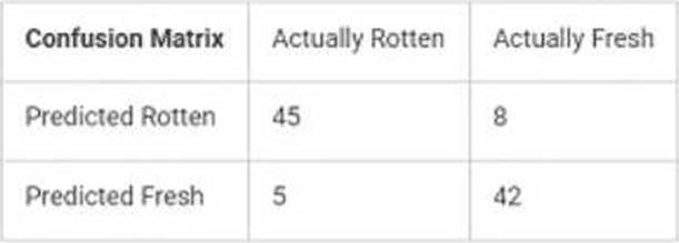 42. Upon testing a model used to detect rotten tomatoes, the following data was observed by the test engineer, based on certain number of tomato images.