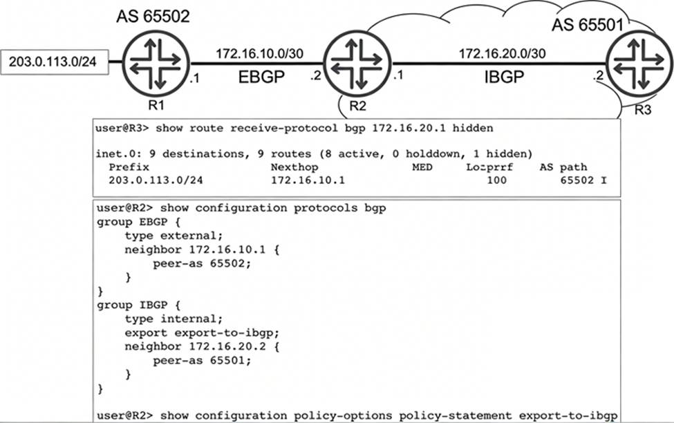 Referring to the exhibit, R1 is advertising prefix 203.0.113.0/24 to R2 over EBGP. R2 is configured to advertise this prefix into IBGP. R3 receives the 203.0.113.0/24 route, however the route is hidden.