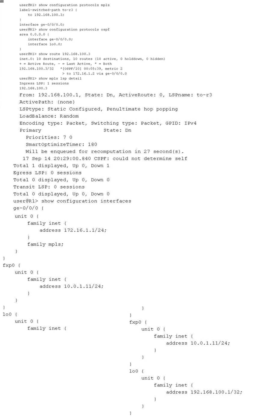 You have configured an MPLS LSP to 192.168.100.3. However, the LSP is in the down state.