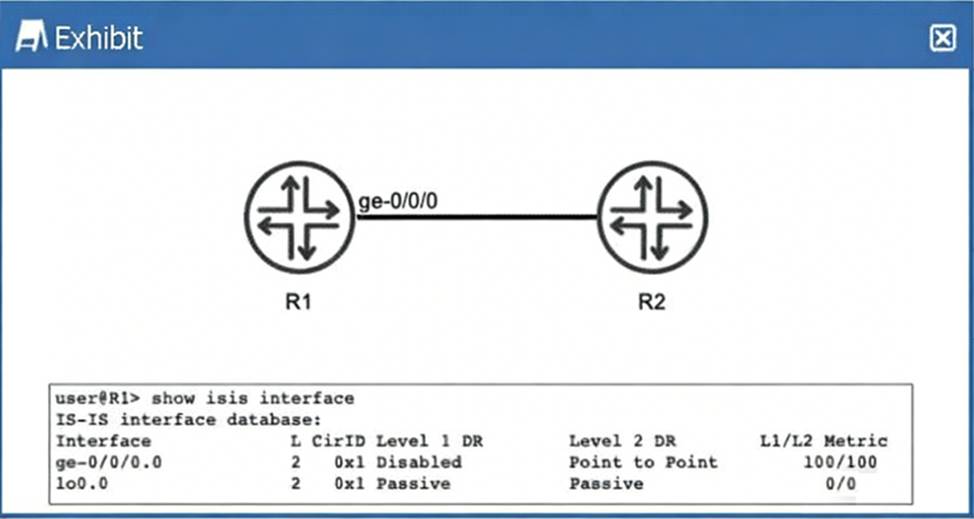 Referring to the exhibit, R1 and R2 are configured to run IS-IS. The IS-IS adjacency between R1 and R2 is up.