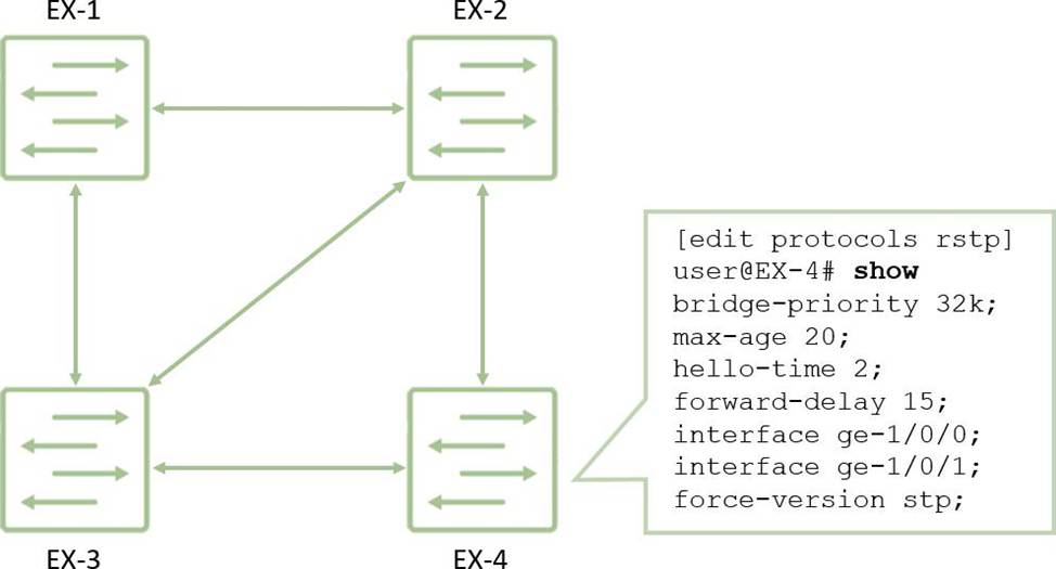 23. You have configured the four EX Series switches with RSTP, as shown in the exhibit. You discover that whenever a link between switches goes up or down, the switches take longer than expected for RSTP to converge, using the default settings.
