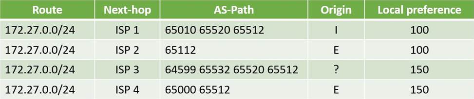 24. You are receiving the BGP route shown in the exhibit from four different upstream ISPs.