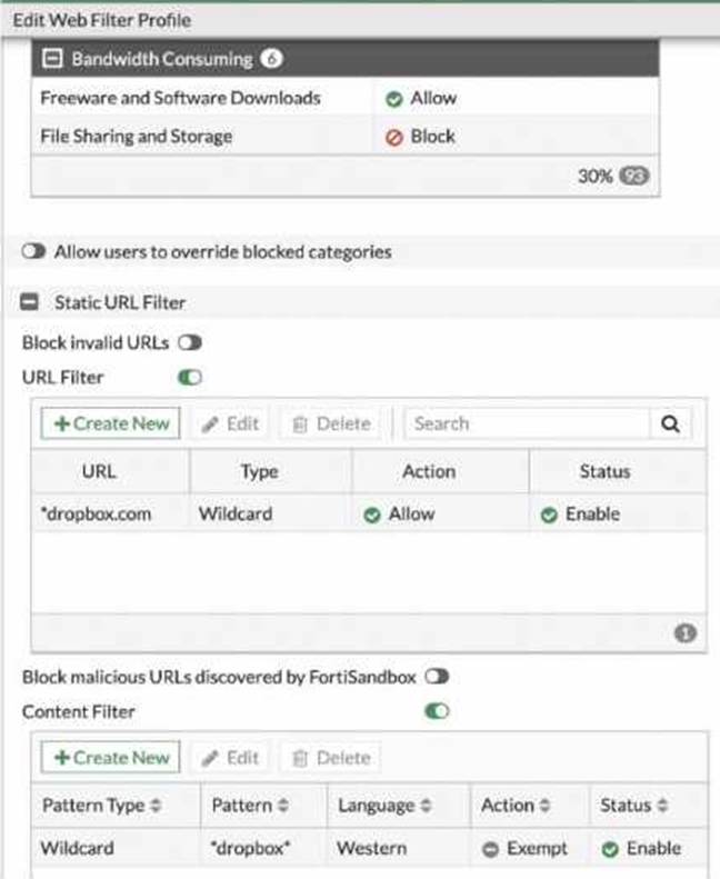 Which action does FortiGate lake if a user attempts to access www. dropbox. com, which is categorized as File Sharing and Storage?