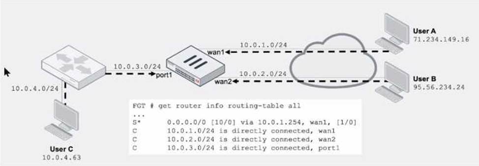Refer to the exhibits, which show the configuration on FortiGate and partial internet session information from a user on the internal network.
