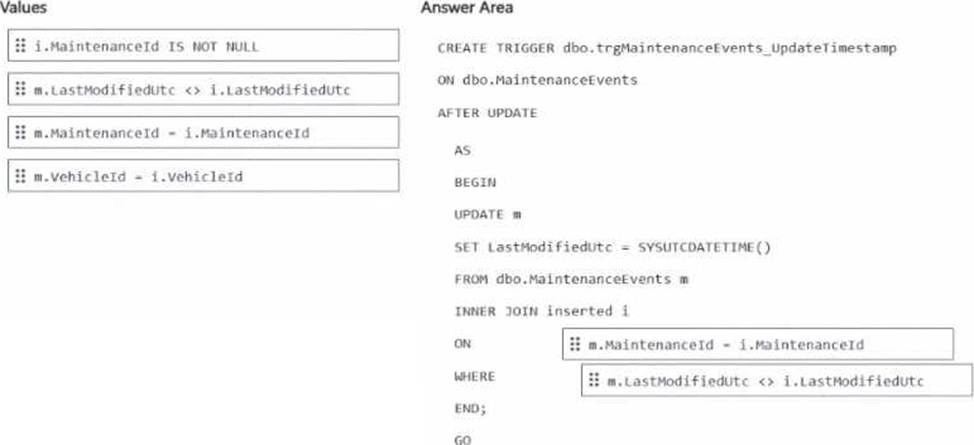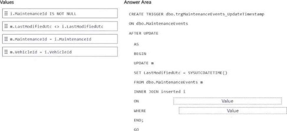 • Ensure that any changes to a row in the MaintenanceEvents table updates the corresponding value in the LastModif reduce column to the time of the change.