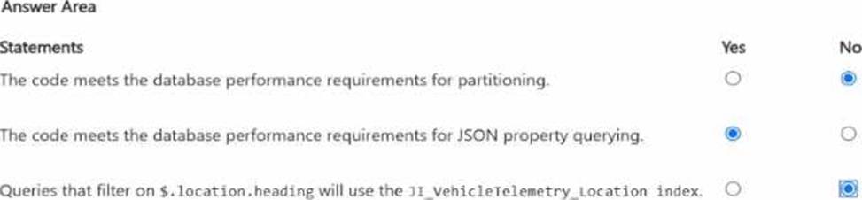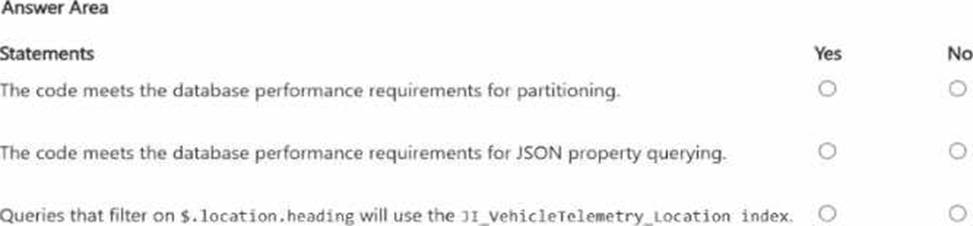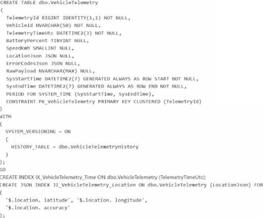 • latitude, longitude, and accuracy JSON properties must be filtered by using an index seek. Contoso identifies the following maintenance data requirements:
