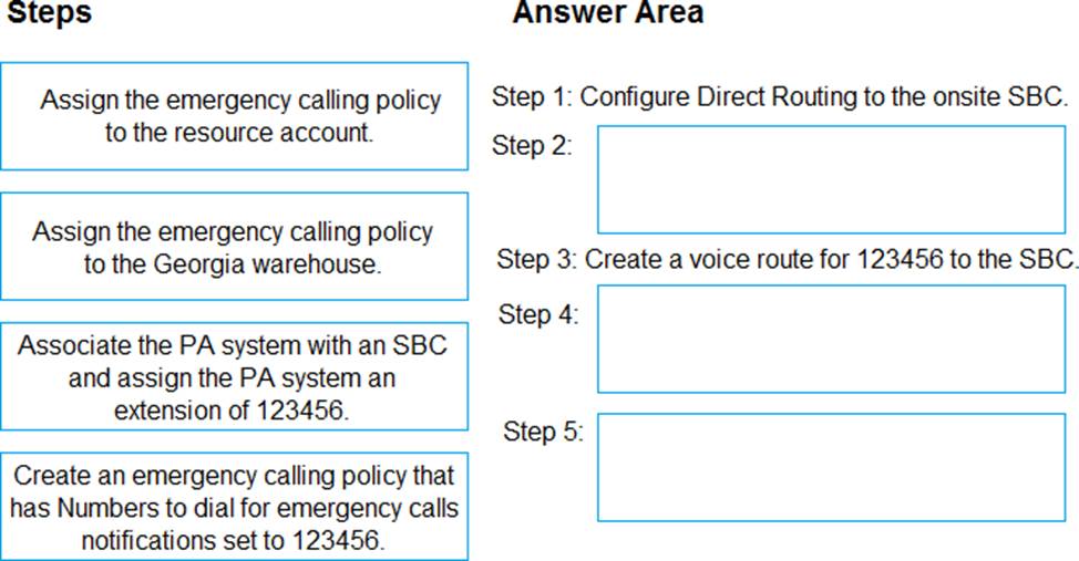 Currently, users ax the company's warehouse in Georgia can call the PA system by dialing 123456. All calls to emergency services from the warehouses are played over the warehouses' PA system automatically.