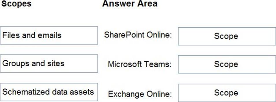 Which scope should you recommend for the sensitivity label policies? To answer, drag the appropriate scopes to the correct locations. Each scope may be used once, more than once, or not at all. You may need to drag the split bar between panes or scroll to view content. NOTE: Each correct selection is worth one point.