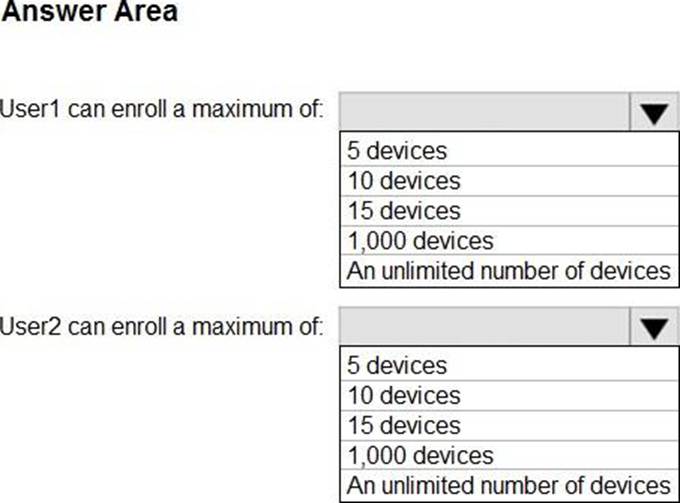 What is the maximum number of devices that User1 and User2 can enroll in Intune? To answer, select the appropriate options in the answer area. NOTE: Each correct selection is worth one point.