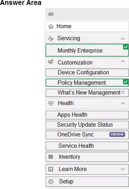 Which two settings should you configure in the Microsoft 365 Apps admin center? To answer, select the appropriate settings in the answer area. NOTE: Each correct selection is worth one point.