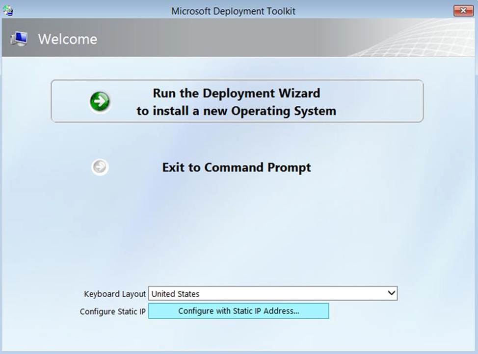 When computers start from the LiteTouchPE_x64.lso image and connect to MDT1. the welcome screen appears as shown In the following exhibit.