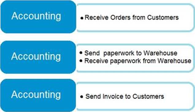 The accounting team enters orders for the sales team, sends pick tickers back to the warehouse, and organizes shipping documents. The accounting team invoices the orders when they receive instructions from the warehouse that an order shipped.