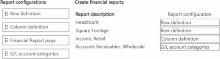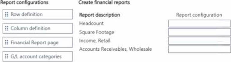 Which report configuration should you use to add the report descriptions lo financial reports? To answer, move the appropriate report configurations to the correct report descriptions. You may use each report configuration once, more than once, of not at all. You may need to move the split bar between panes or scroll to view content. NOTE: Each correct selection is worth one point.