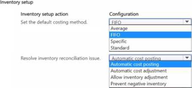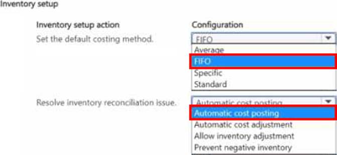 Which two inventory setup configurations should you use? To answer, select the appropriate options in the answer area.