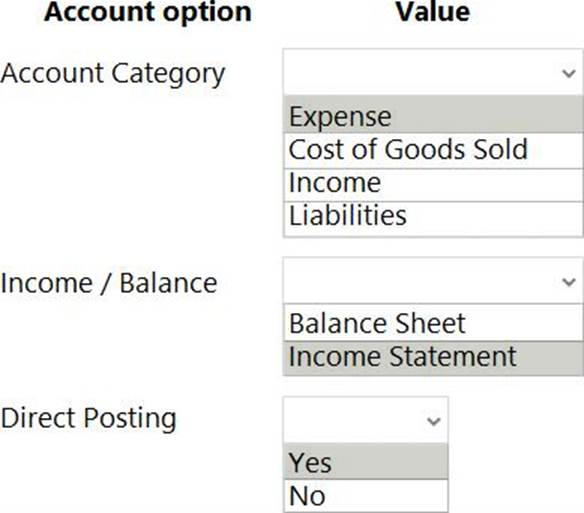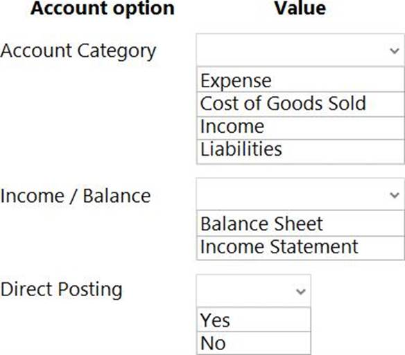 You are implementing Dynamics 365 Business Central. The accounting manager of the company provides you with the chart of accounts.