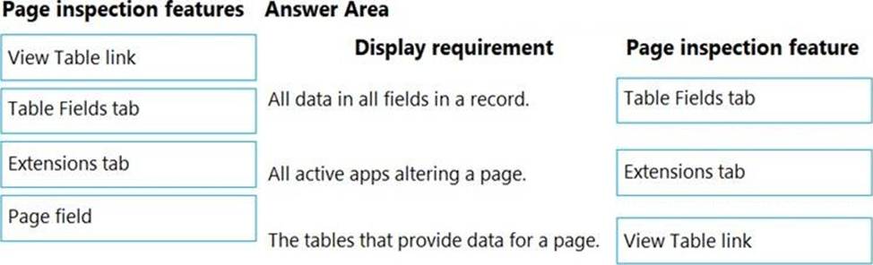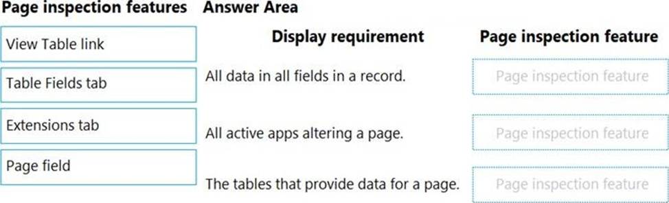 Which features should you use? To answer, drag the appropriate page inspection features to the correct display requirements. Each page inspection feature may be used once, more than once, or not at all. You may need to drag the split bar between panes or scroll to view content. NOTE: Each correct selection is worth one point.