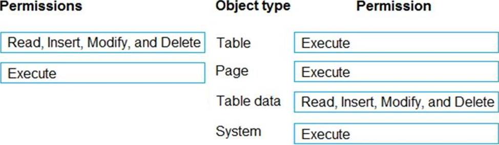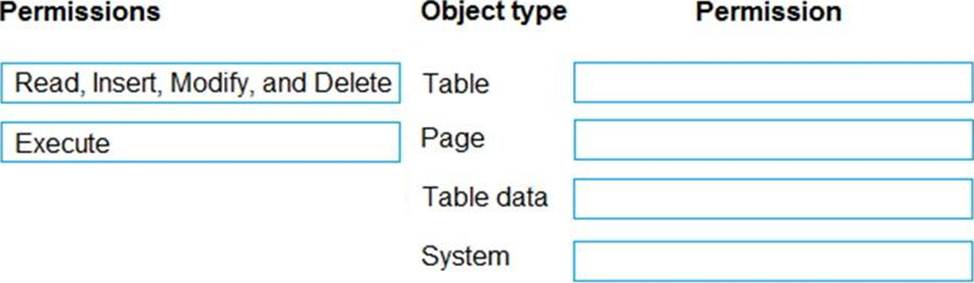 Which permission or set of permissions is allowed for each type of object? To answer, drag the appropriate permissions to the correct object types. Each permission set may be used once, more than once, or not at all. You may need to drag the split bar between panes or scroll to view content. NOTE: Each correct selection is worth one point.