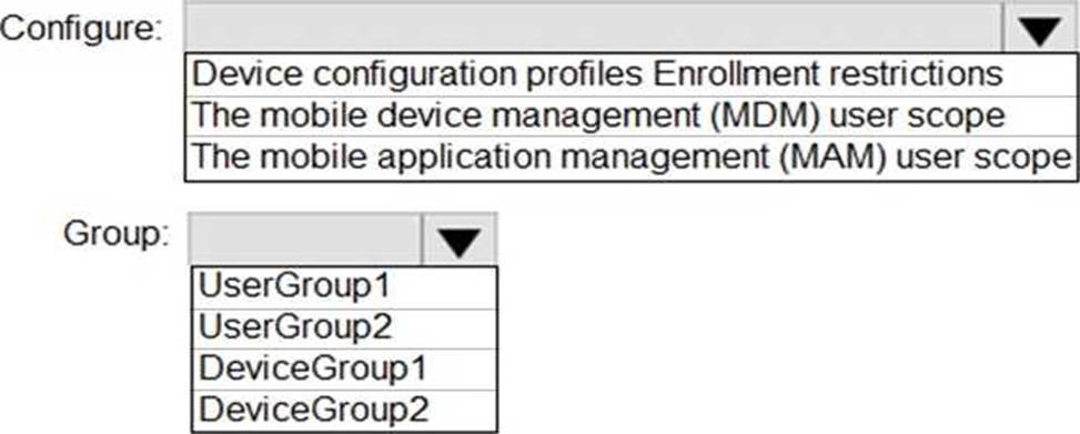 What should you configure, and to which group should you assign the configurations? To answer, select the appropriate options in the answer area. NOTE: Each correct selection is worth one point.