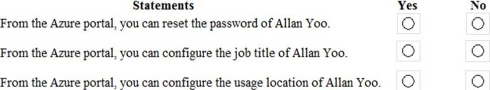 An on-premises Active Directory user account named Allan Yoo is synchronized to Azure AD. You view Allan’s account from Microsoft 365 and notice that his username is set to [email protected].