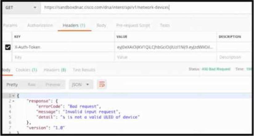 POSTMAN is showing an attempt to retrieve network device information from Cisco Catalyst Center (formerly DNA Center) API.