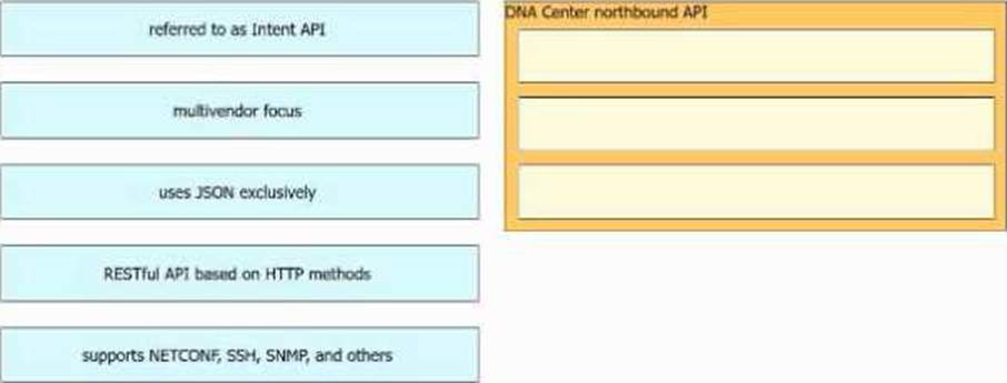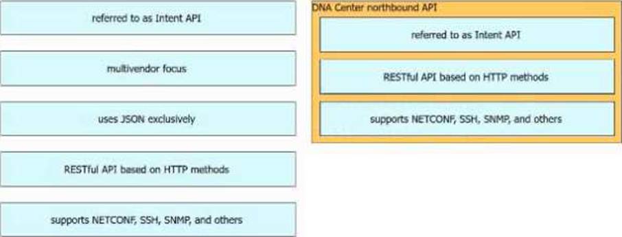 Drag and drop the Cisco Catalyst Center (formerly DNA Center) northbound API characteristics from the left to the right. Not all options are used.