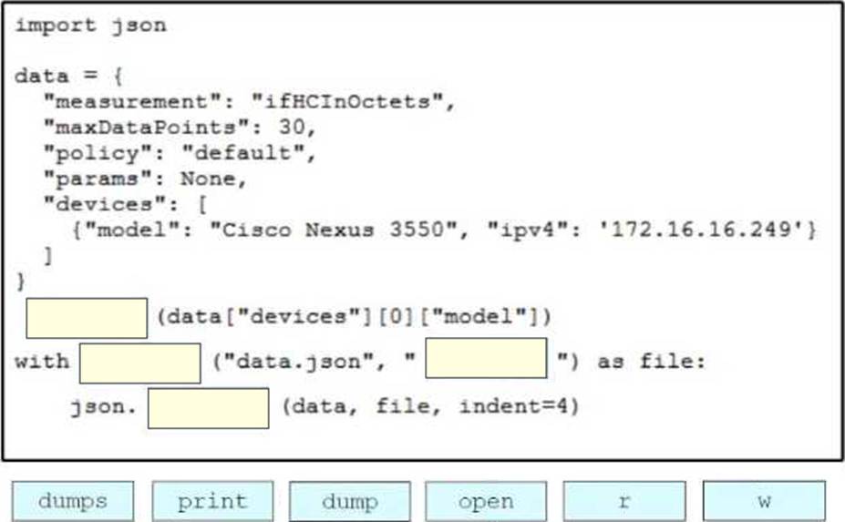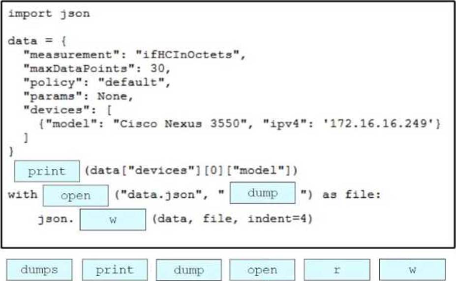 Drag and drop the code snippets from the bottom onto the blanks in the Python script to print the device model to the screen and write JSON data to a file. Not all options are used