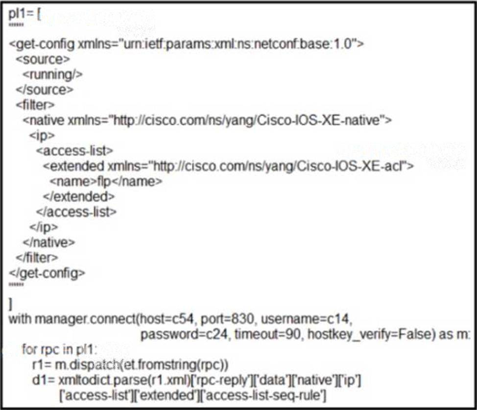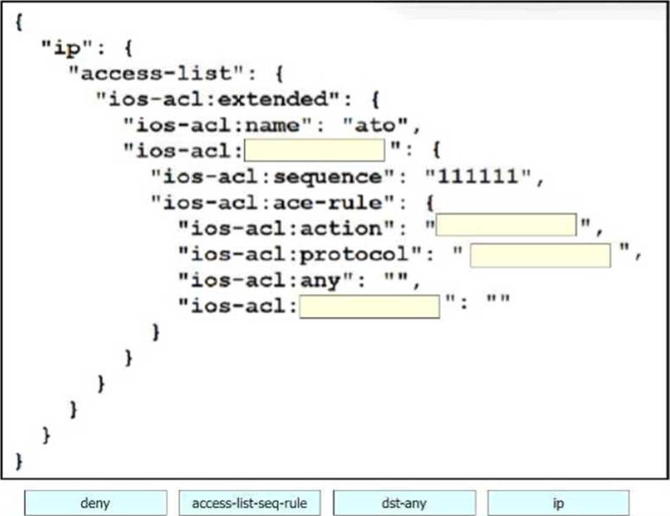 Drag and drop the code snippets from the bottom onto the blanks in the code to construct a request that configures a deny rule on an access list?