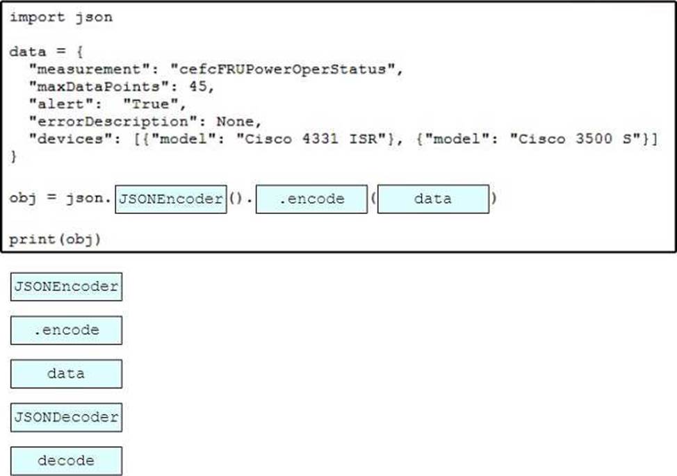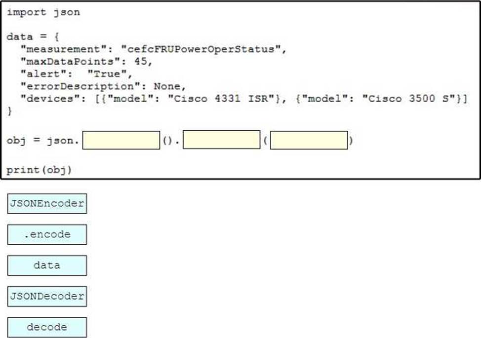 Drag and drop the code snippets from the bottom onto the blanks in the script to convert a Python object into a JSON string. Not all options are used