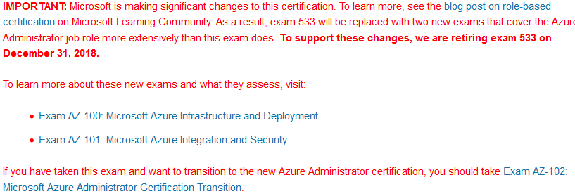 As a new released exam for Azure certification, AZ-100 exam is the beta version now. Before we talking AZ-100 exam, we must refer to 70-533 Implementing Microsoft Azure Infrastructure Solutions exam first. We have collected the details for Azure 70-533 exam shown as the picture: